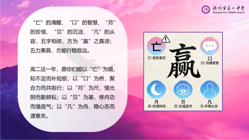 一是,“亡”——存危机意识:秉持“生于忧患,死于安乐”的清醒,牢记“学如逆水行舟,不进则退”,警惕学习短板,筑牢知识根基;二是,“口”——善沟通协作:践行“独学而无友,则孤陋而寡闻”的古训,借师生探讨、同窗互助凝聚合力,做到“二人同心,其利断金”;三是,“月”——惜寸金光阴:铭记“盛年不重来,一日难再晨”的箴言,珍视早读、课堂、晚修的每分每秒,让时光在专注奋斗中沉淀价值;四是,“贝”——守价值底色:以“腹有诗书气自华”为追求,将知识积累、能力淬炼、风骨树立作为立身之本,践行“非学无以广才,非志无以成学”的信念。五是, “凡”——持平常心境:效仿苏轼“一蓑烟雨任平生”的豁达,宠辱不惊看待得失,顺境不骄、逆境不馁,稳步走好求学之路。