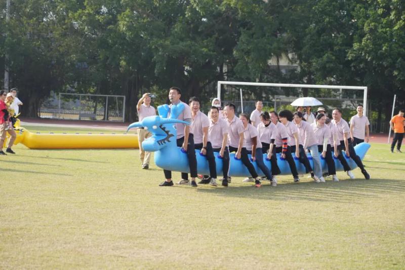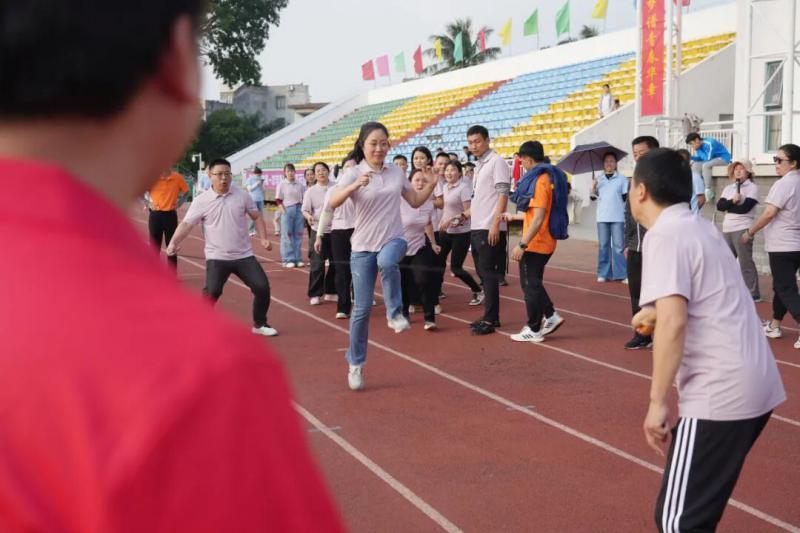本届运动会设置了五项集趣味性、竞技性和协作性于一体的比赛项目,每个项目都充分体现了团队合作的重要性。在男女混合4×100米接力赛中,运动员们配合默契,传递的不仅是接力棒,更是彼此的信任与支持;旱地龙舟比赛现场,“一二一”的口号声整齐有力,队员们步伐一致、节奏统一,展现了出色的协调能力;板鞋竞速接力项目更是将团队协作推向高潮,八人同踏一双板鞋,唯有同心同德、步调一致才能稳步向前;“争分夺秒”跳绳比赛中,摇绳者与跳绳者默契配合,穿梭“∞”字形的身影如行云流水;“排除万难”障碍接力赛场上,教职工们矫健地跨越栏架、灵活地绕过锥桶,展现了不畏困难、勇往直前的精神。每个比赛场地都洋溢着加油声、欢笑声和喝彩声,现场气氛热烈而温馨。
