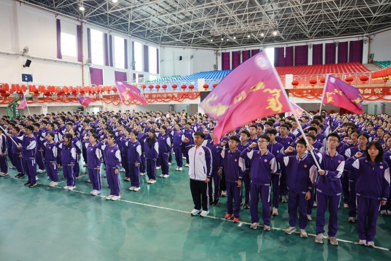 在涂家文校长为各班代表授旗后,各班整齐列队。同学们身姿挺拔,高举右拳,眼神坚毅,在各班领誓人带领下庄严宣誓,少年们的呐喊里满是决战中考的无畏勇气与必胜信念,青春热血在这一刻尽情迸发。随后,在符益精同学的带领下,全体初三学子高举右拳,庄严领誓、齐声呐喊,喊出心底最强音,尽显一中学子无畏向前、决胜六月、不负青春的壮志与豪情。