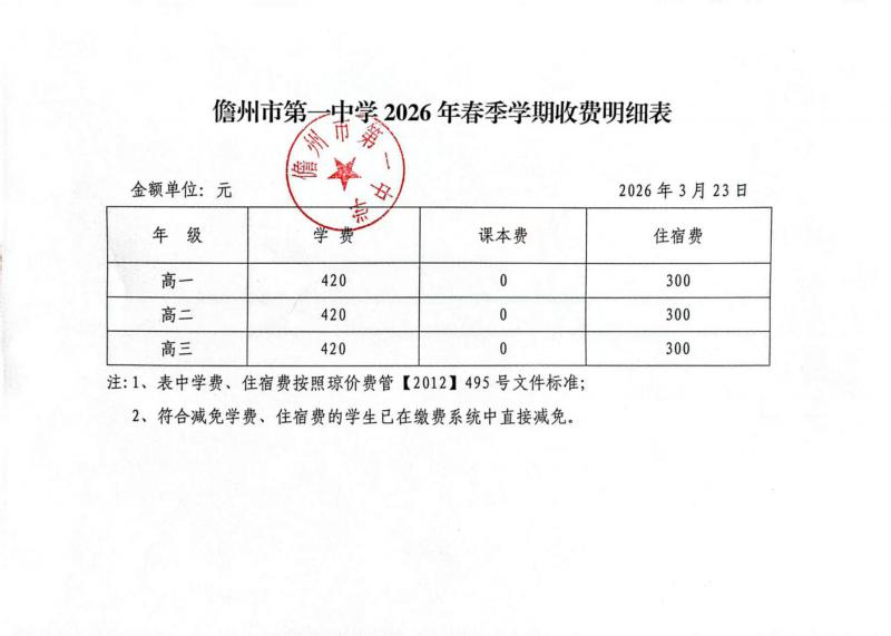 儋州市第一中学2026年春季学期收费明细表