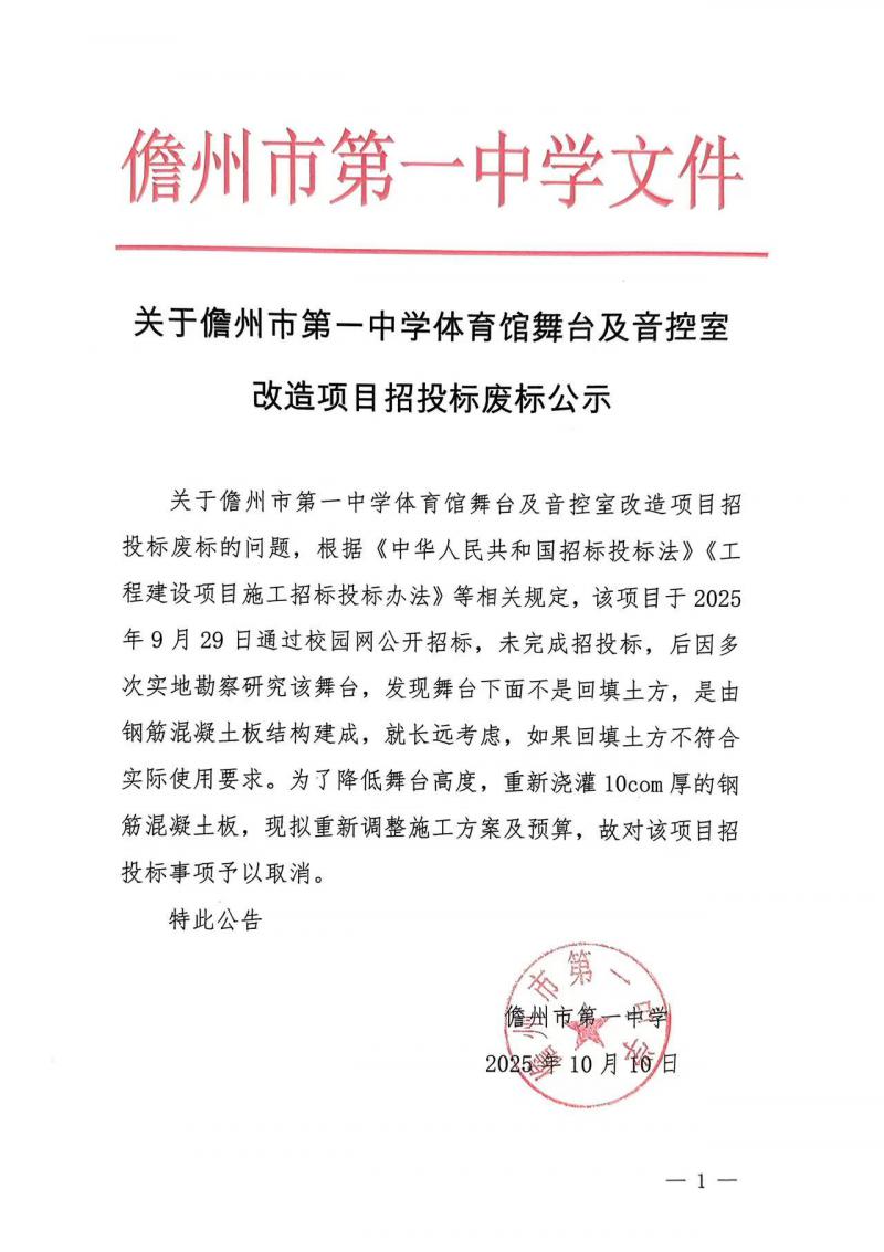 关于儋州市第一中学体育馆舞台及音控室改造项目招投标废标公示