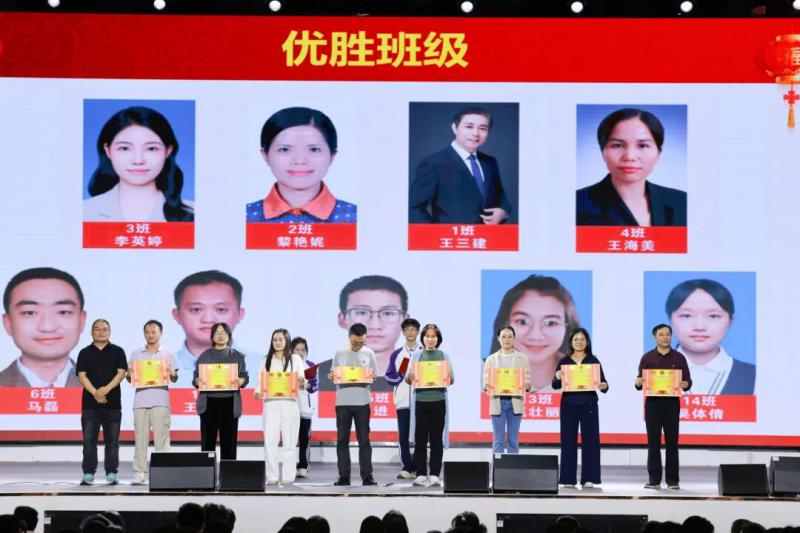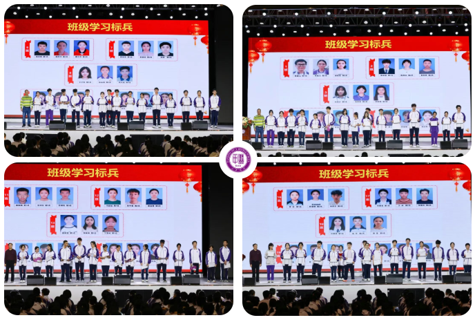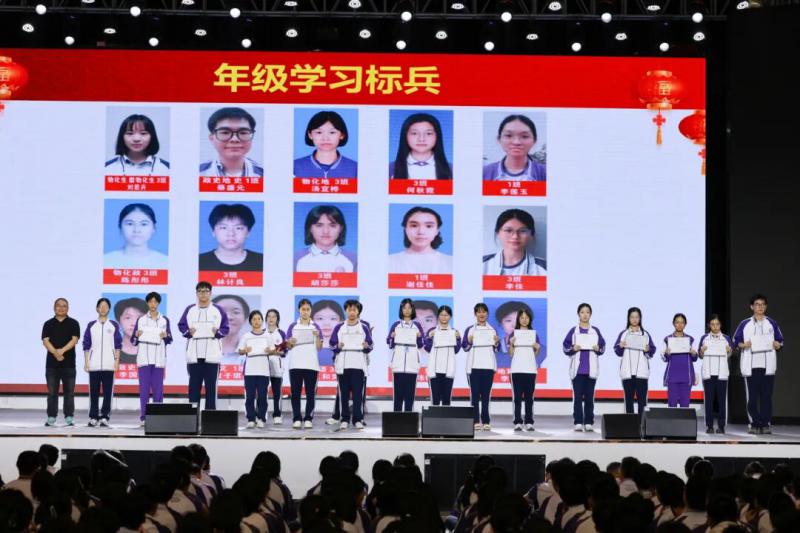大会伊始,教务室主任、年级分管中干羊英亮宣读《高二年级期中考试表彰决定》。表彰评定紧扣总分排名、组合成绩、单科优势及进步幅度四大维度,设立“年级学习标兵”“班级学习标兵”“进步之星”“优胜班级”等荣誉称号。一纸决定,既是对学子过往拼搏的嘉奖,亦是为全体同学树立的期末备考榜样,台上少年意气风发,眉宇间尽是“恰同学少年,风华正茂”的自信昂扬,台下掌声雷动,冲刺期末的奋进共识油然而生。