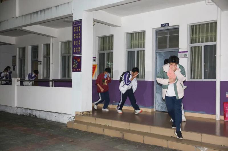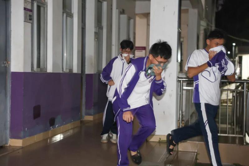 随着急促的警报声响起,演练正式开始。各宿舍学生迅速反应,在宿舍生活老师和楼层引导教师的指挥下,用湿毛巾捂住口鼻,弯腰低姿,沿着预定路线快速、有序地撤离宿舍楼栋。