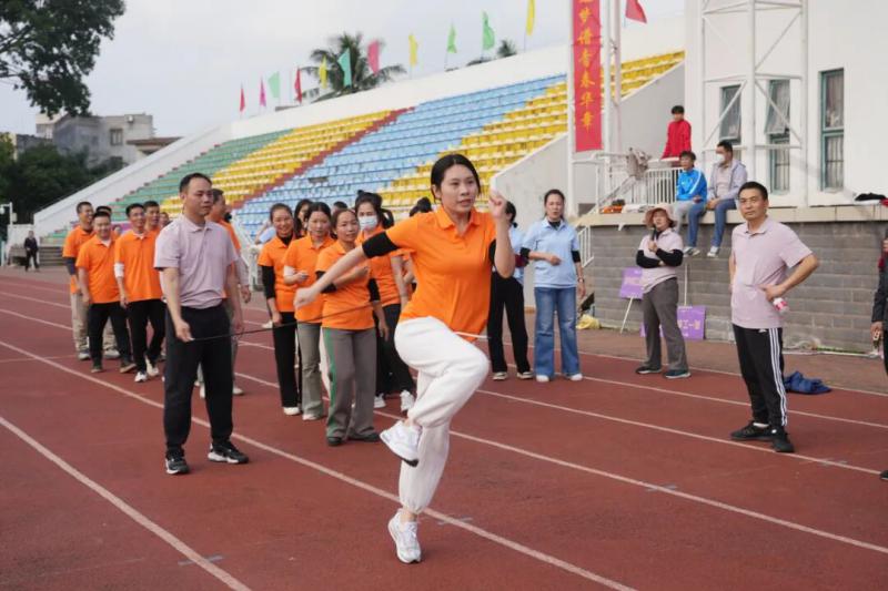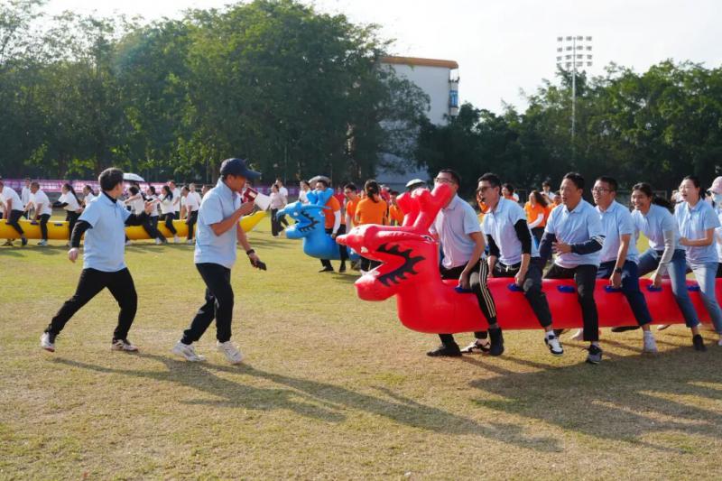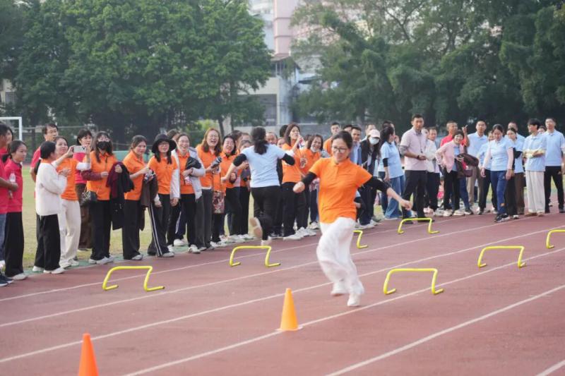本届运动会设置了五项集趣味性、竞技性和协作性于一体的比赛项目,每个项目都充分体现了团队合作的重要性。在男女混合4×100米接力赛中,运动员们配合默契,传递的不仅是接力棒,更是彼此的信任与支持;旱地龙舟比赛现场,“一二一”的口号声整齐有力,队员们步伐一致、节奏统一,展现了出色的协调能力;板鞋竞速接力项目更是将团队协作推向高潮,八人同踏一双板鞋,唯有同心同德、步调一致才能稳步向前;“争分夺秒”跳绳比赛中,摇绳者与跳绳者默契配合,穿梭“∞”字形的身影如行云流水;“排除万难”障碍接力赛场上,教职工们矫健地跨越栏架、灵活地绕过锥桶,展现了不畏困难、勇往直前的精神。每个比赛场地都洋溢着加油声、欢笑声和喝彩声,现场气氛热烈而温馨。